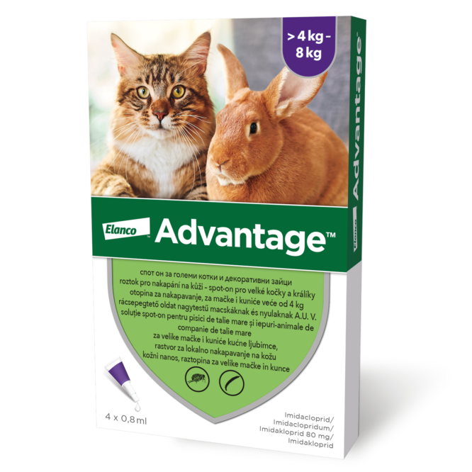 < 4 kg Advantage® za male mačke i kuniće kućne ljubimce 0,4 ml / Imidakloprid (mg/kg telesne mase) Minimalno 10 ≥ 4 kg Advantage® za velike mačke i kuniće kućne ljubimce 0,8 ml / Imidakloprid (mg/kg telesne mase) Maksimalno 20