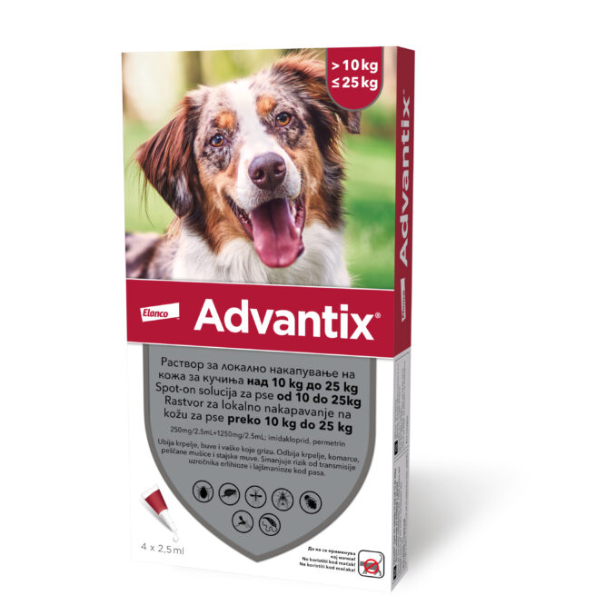 Advantix®, rastvor za lokalno nakapavanje na kožu za pse preko 10 kg do 25 kg – zapremina 2.5 mL / Imidakloprid (mg/kg tm) 10-25 / Permetrin (mg/kg tm) 50-125