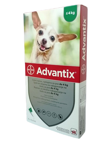 Advantix®, rastvor za lokalno nakapavanje na kožu za pse do 4 kg – zapremina 0.4 mL / Imidakloprid (mg/kg tm) najmanje 10 / Permetrin (mg/kg tm) najmanje 50