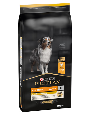 PURINA ® PRO PLAN ® All Sizes Adult Dog Light / Sterilised. Kompletna suva hrana za kućne ljubimce za gojazne ili sterilisane odrasle pse svih veličina, bogata piletinom